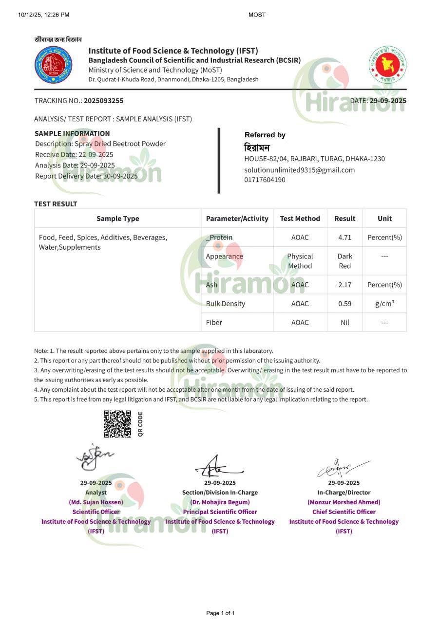 100% ন্যাচারাল, কোন প্রিজারভেটিভ নয় – শুধু খাঁটি বিটরুট পাউডার।
